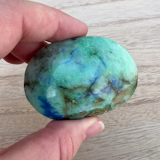 Chrysocolla in Quartz Palm Stone combines the calming and balancing energies of chrysocolla with the amplifying and protective qualities of clear quartz. This polished palm stone is ideal for meditation and energy work, helping to promote emotional clarity and enhance communication. Its smooth surface fits comfortably in your hand, making it perfect for daily use or as a grounding tool during spiritual practices.